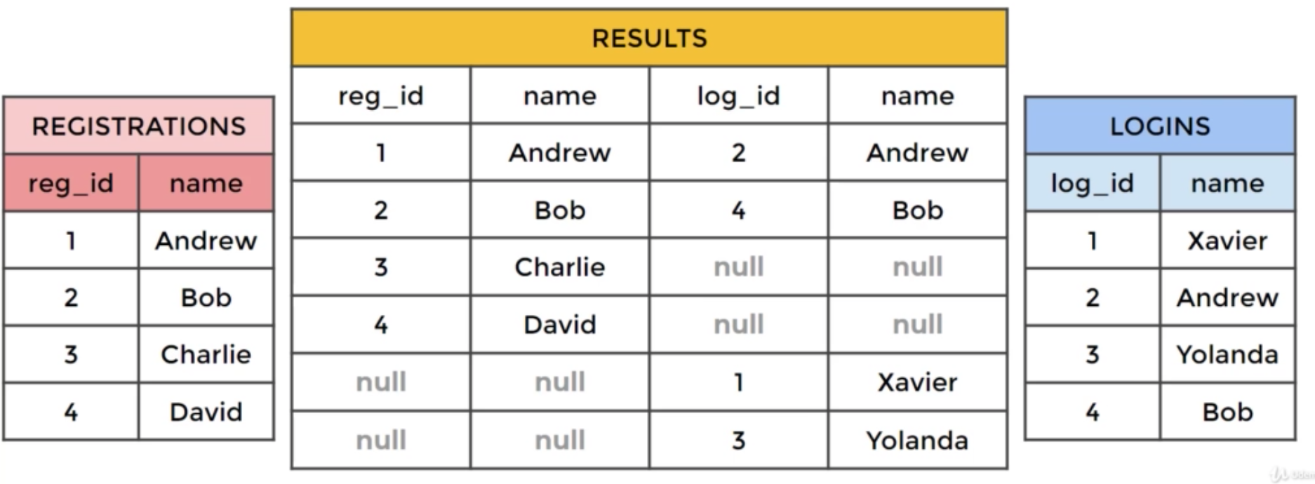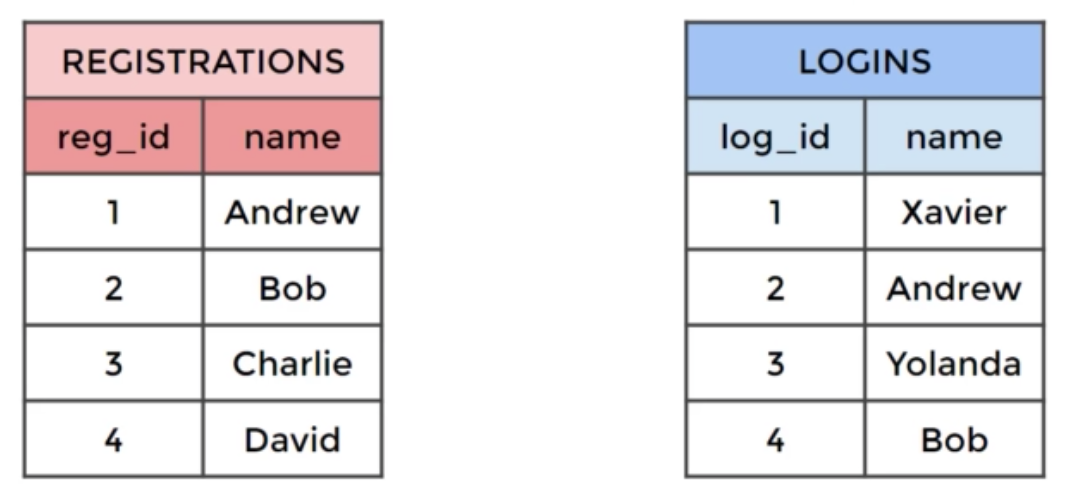 다음과 같은 SQL문을 사용해 아래 이미지처럼 데이터를 묶을 수 있을 것이다,.SELECT * FROM registrations FULL OUTER JOIN logins ON registrations.name = logins.name;